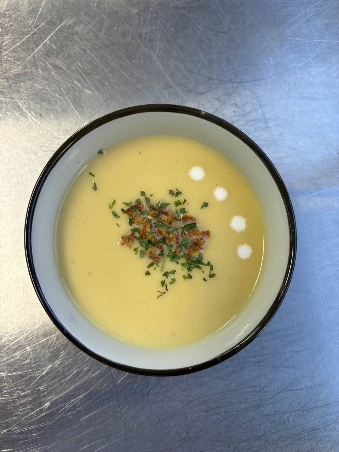 6ミキサーから鍋に移し、温めながらコンソメ、食塩、こしょうで味を調える。