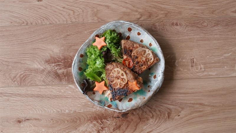 5れんこん、にんじん、トマトをレンジストームの下に敷き、4の肉だね半分を全体に敷き詰め、チーズをのせる。
