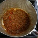 小麦粉をふり入れてよくいため、水煮トマトとcを加えて煮込む。