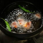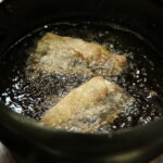 5⑤ししとうは穴をあけ、赤パプリカは乱切りにし、どちらも素揚げにする。