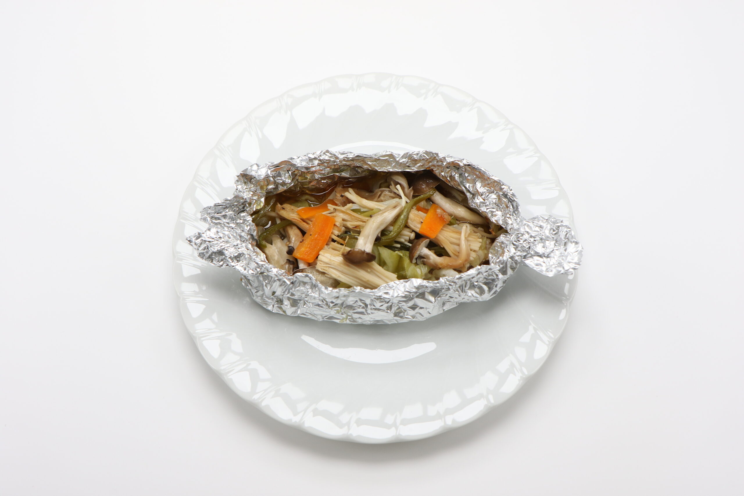 3③アルミホイルの中央に①を塩麴をつけたままおき、②をのせる。