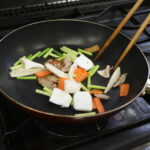 1①エリンギ、にんじん、竹の子は短冊切りにし、茎にんにくは4㎝長さに切る。