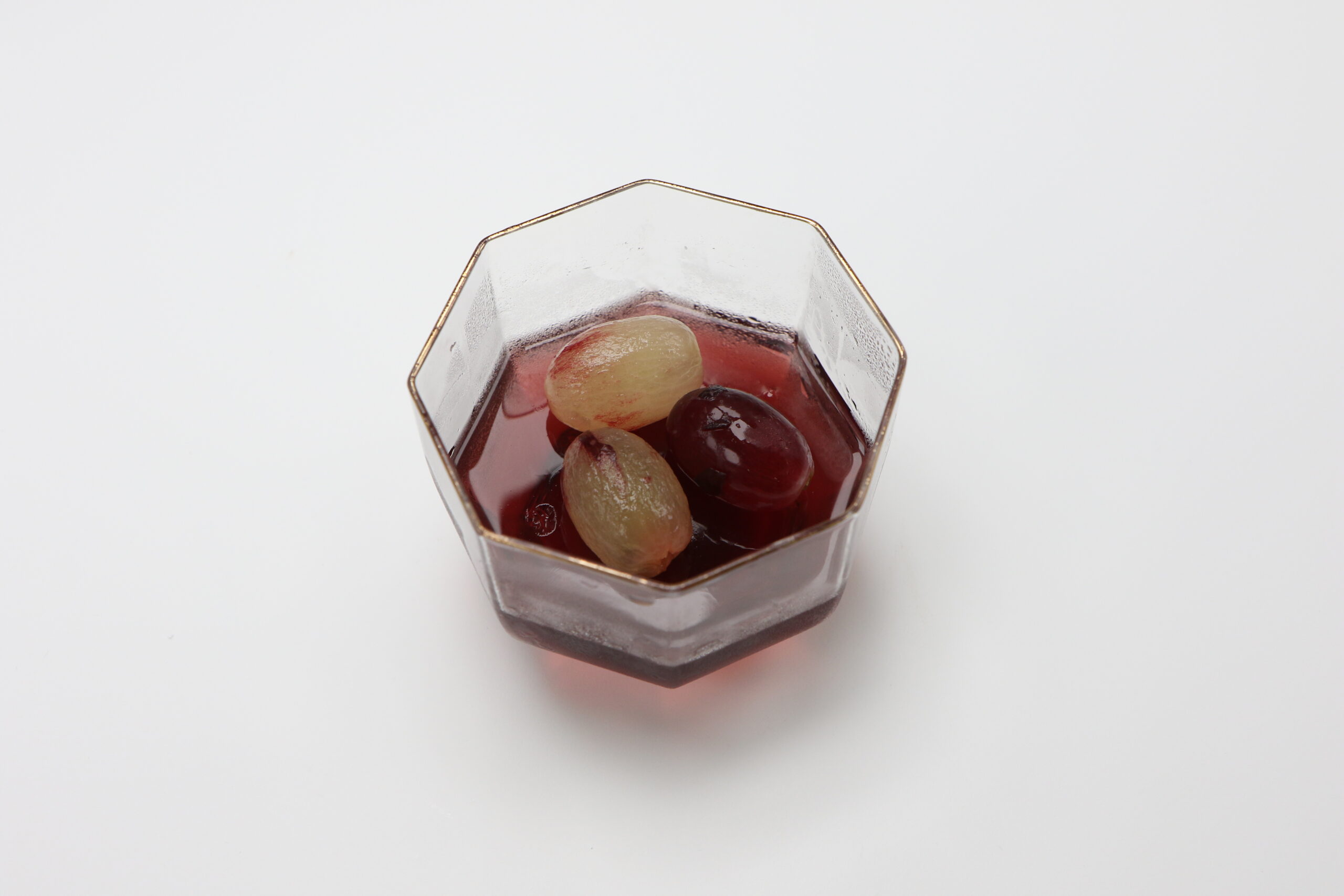 3③器に流し入れ、冷蔵庫で冷やし固める。上に粒のぶどうをかざる