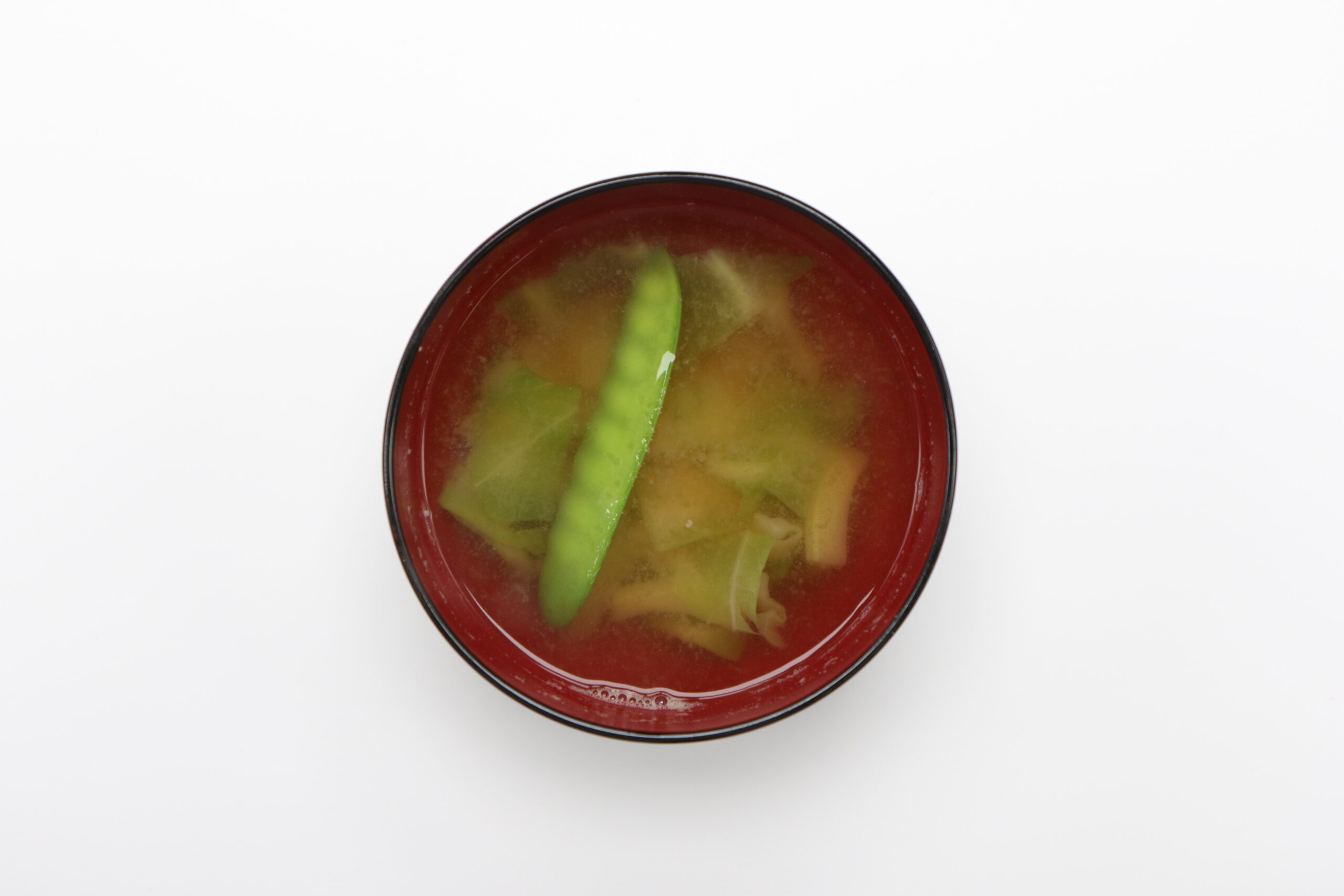 3③火が通ったらみそをとき入れる。わんに盛り、さやえんどうを入れる。